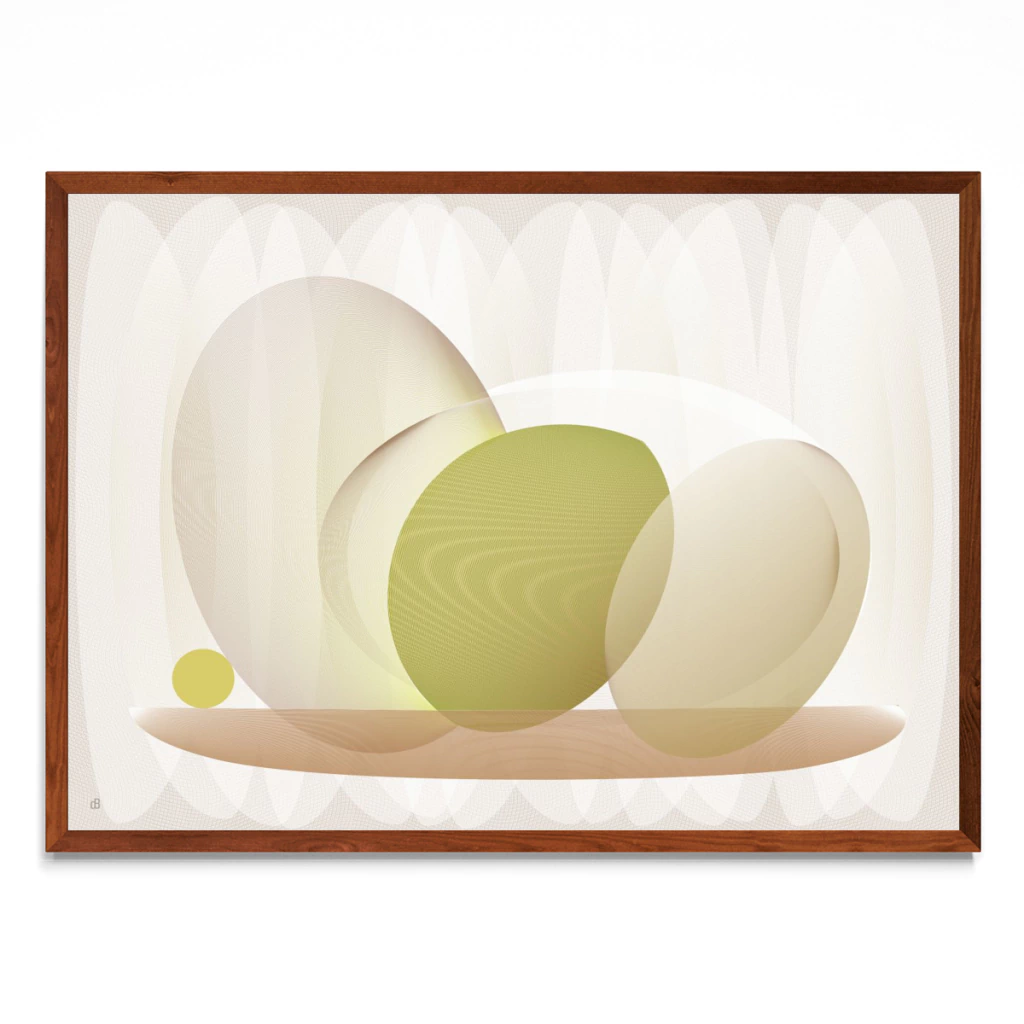 El uso del efecto muaré hace que los elementos de esta obra sean ligeros y aireados. La composición formal tiene sus raíces en la pintura clásica de naturaleza muerta.