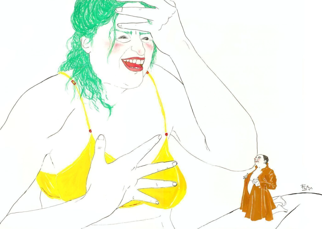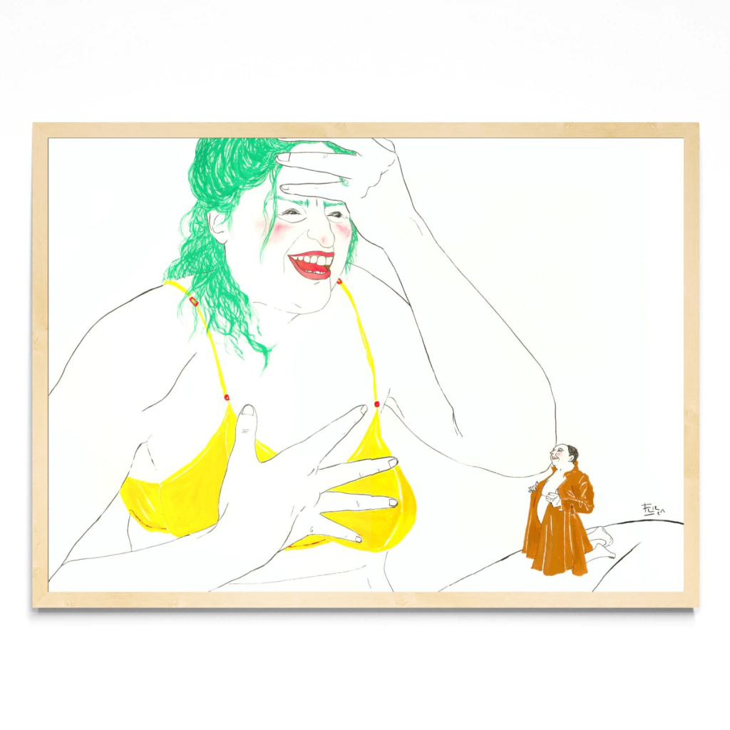 Obra que pertenece a la serie Funny Petit, donde mujeres gigantes ríen a carcajadas de este pequeño hombre exhibiéndose en su piloto. La serie fue exhibida en la galería Sonoridad Amarilla en Buenos Aires en el 2005.