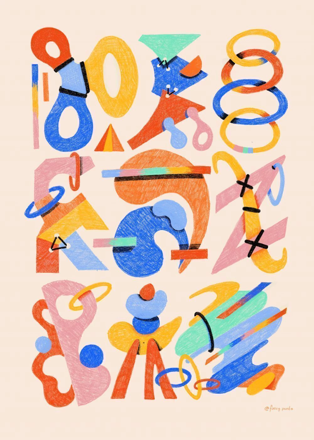 Dibujo lápiz y pastel digital. Composición de Formas geométricas irregulares y orgánicas. Triángulos, círculos, cuadrados y gestos caligráficos. Fondo color beige . Colores primarios, rojo azul y amarillo. Textura rugosa de trazos de lapiz y pastel color.