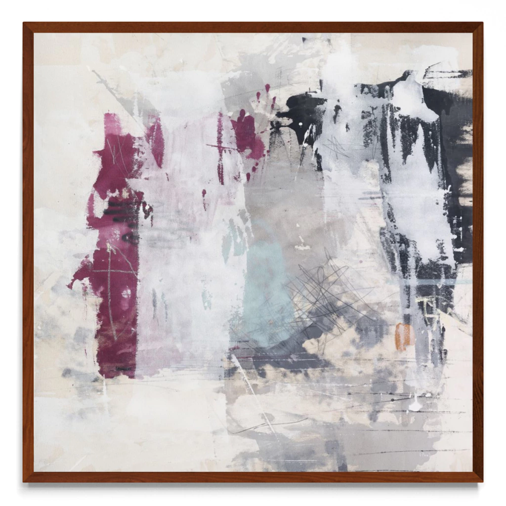 Bordo, negro y celeste dialogan en una composición abstracta, con fuerza y profundidad.