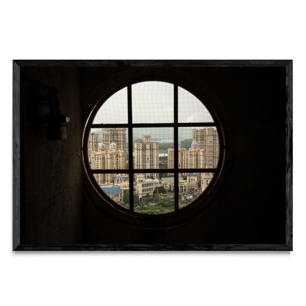 Vista de edificios a través de una ventana en Bombay, India.