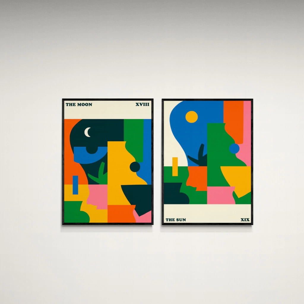 Esta interpretación geométrica de las cartas de Tarot del Sol y la Luna aportan un toque moderno y colorido a tu espacio.