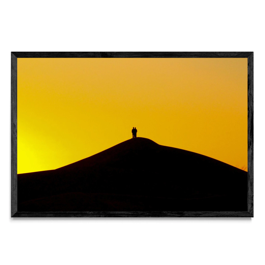 Silueta de 2 personas observando el amanecer en la cima de una duna en el desierto de Merzouga en Marruecos.
