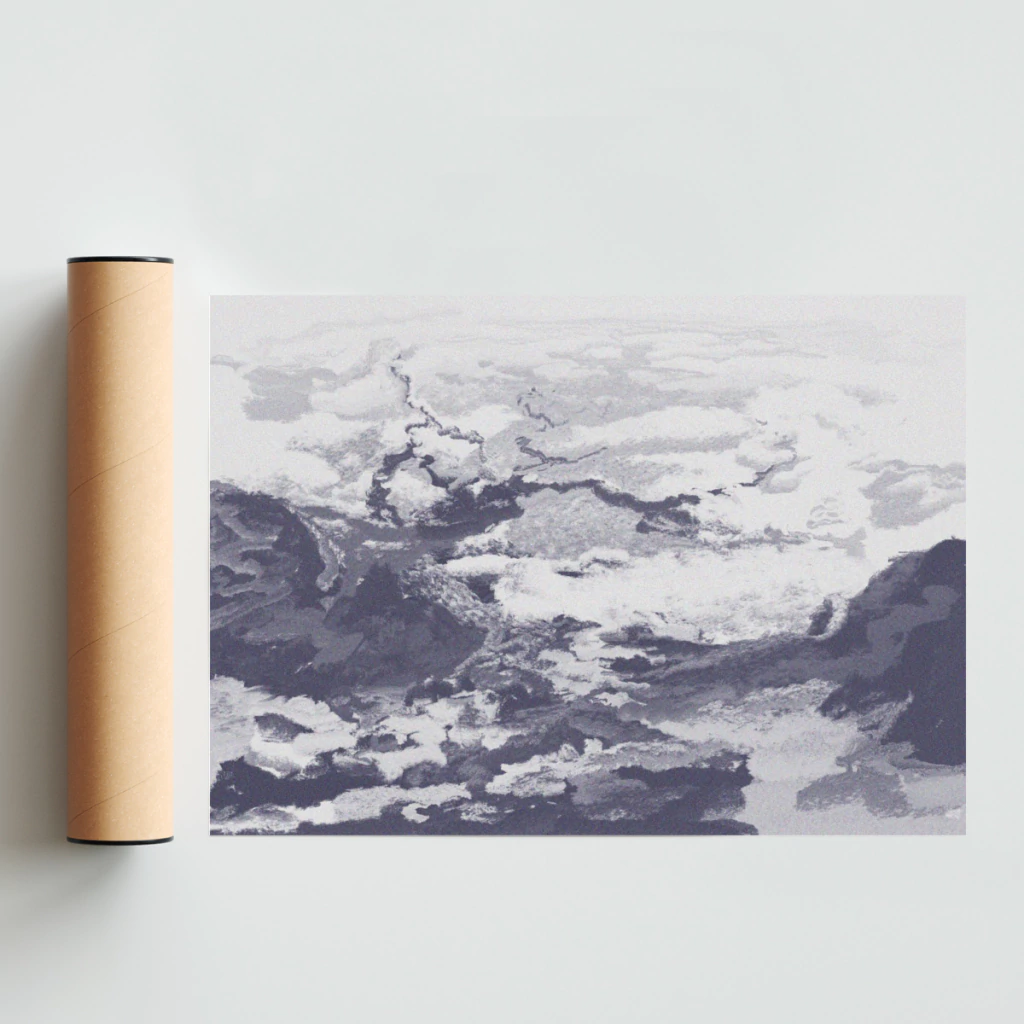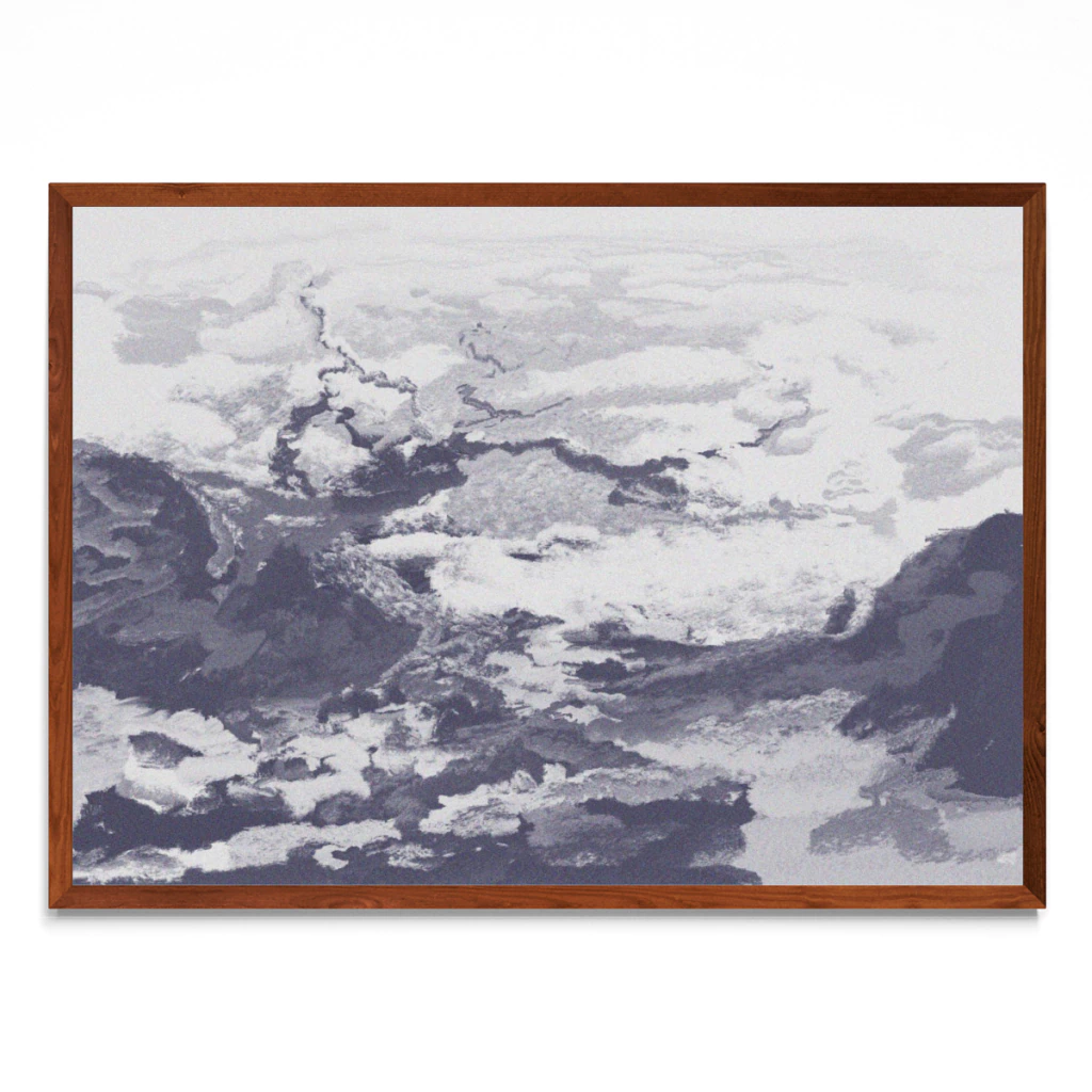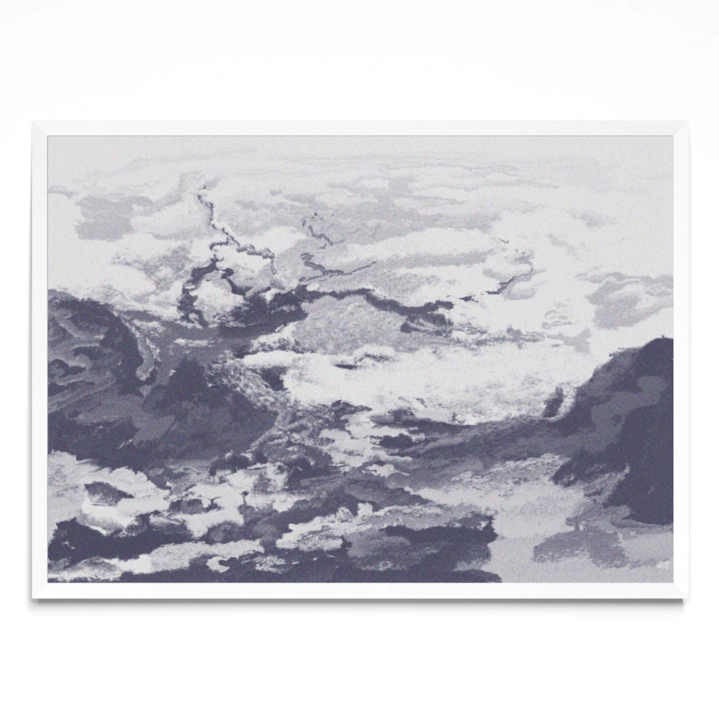 Una ilustración que muestra en altura la complejidad de un valle y sus nubes desde una perspectiva omnipotente.