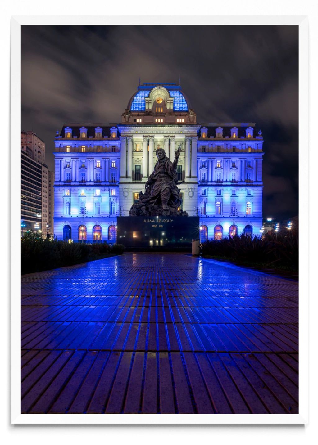 Fotografía de larga exposición tomada en una noche lluviosa donde se observa el monumento a Juana Azurduy y de fondo el edificio del CCK ex Palacio de Correos.