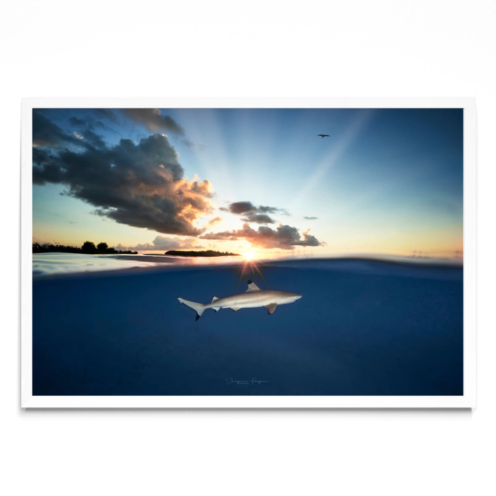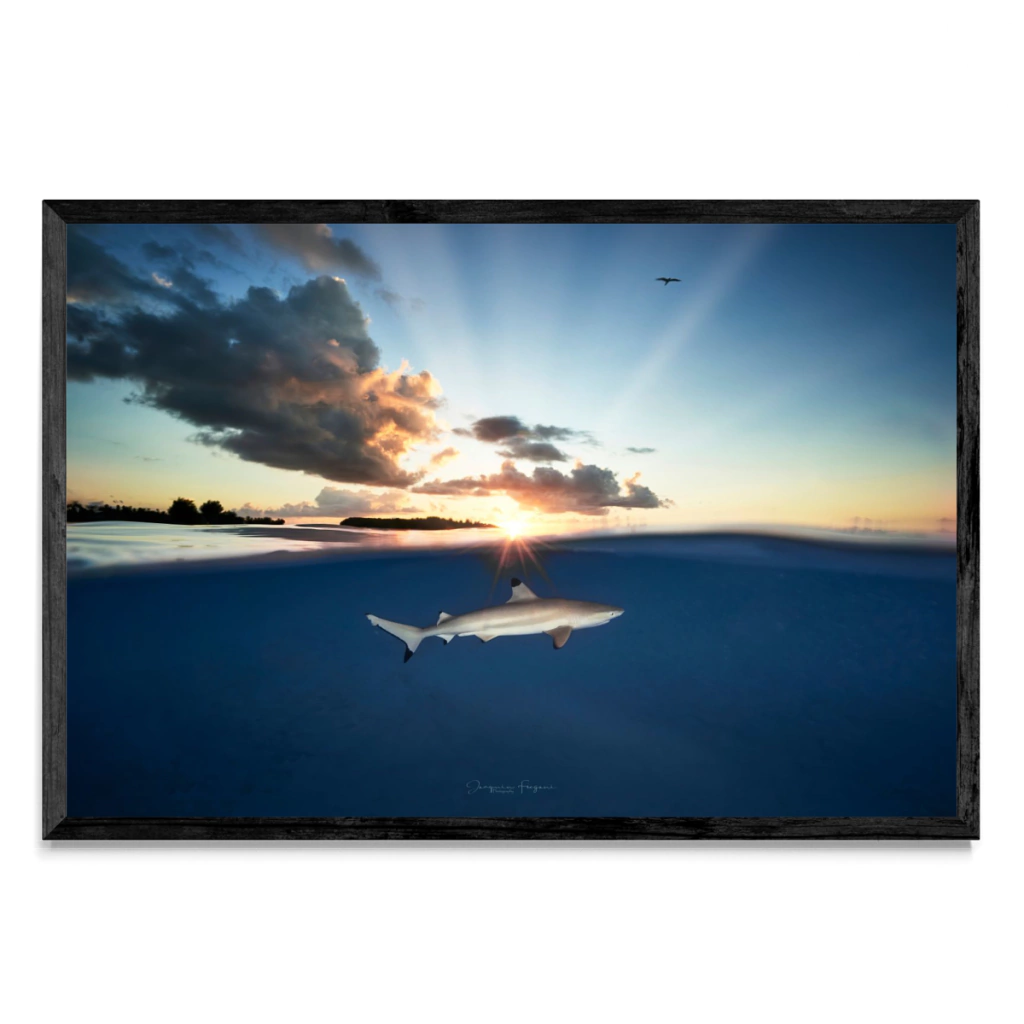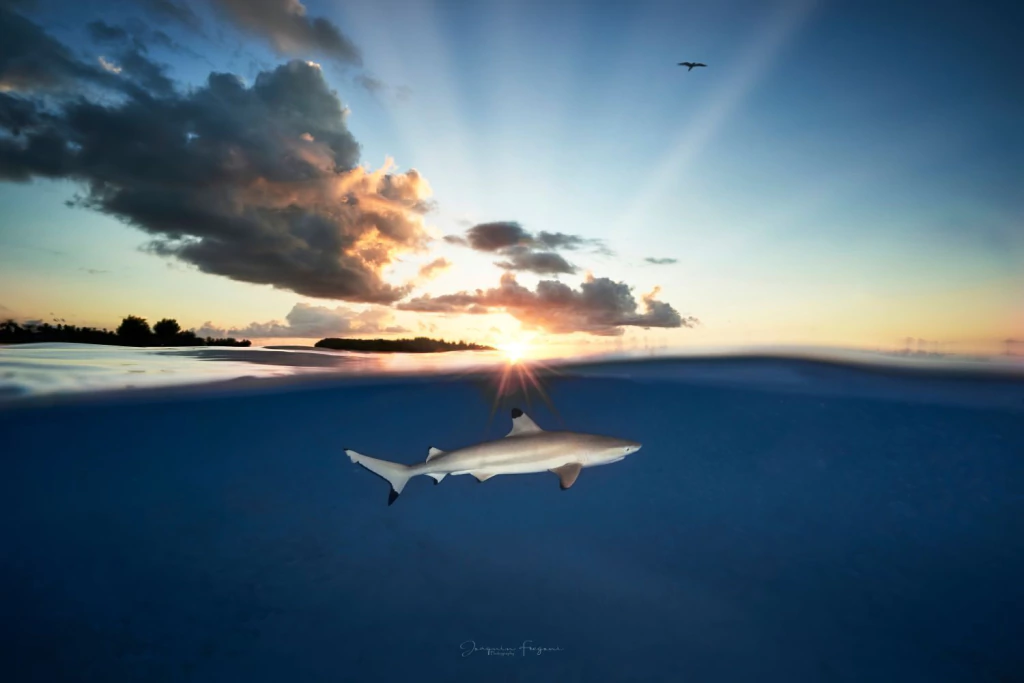 Foto dividida de un tiburon punta negra y el atardecer. Tomada en Moorea, Polinesia Francesa 2020