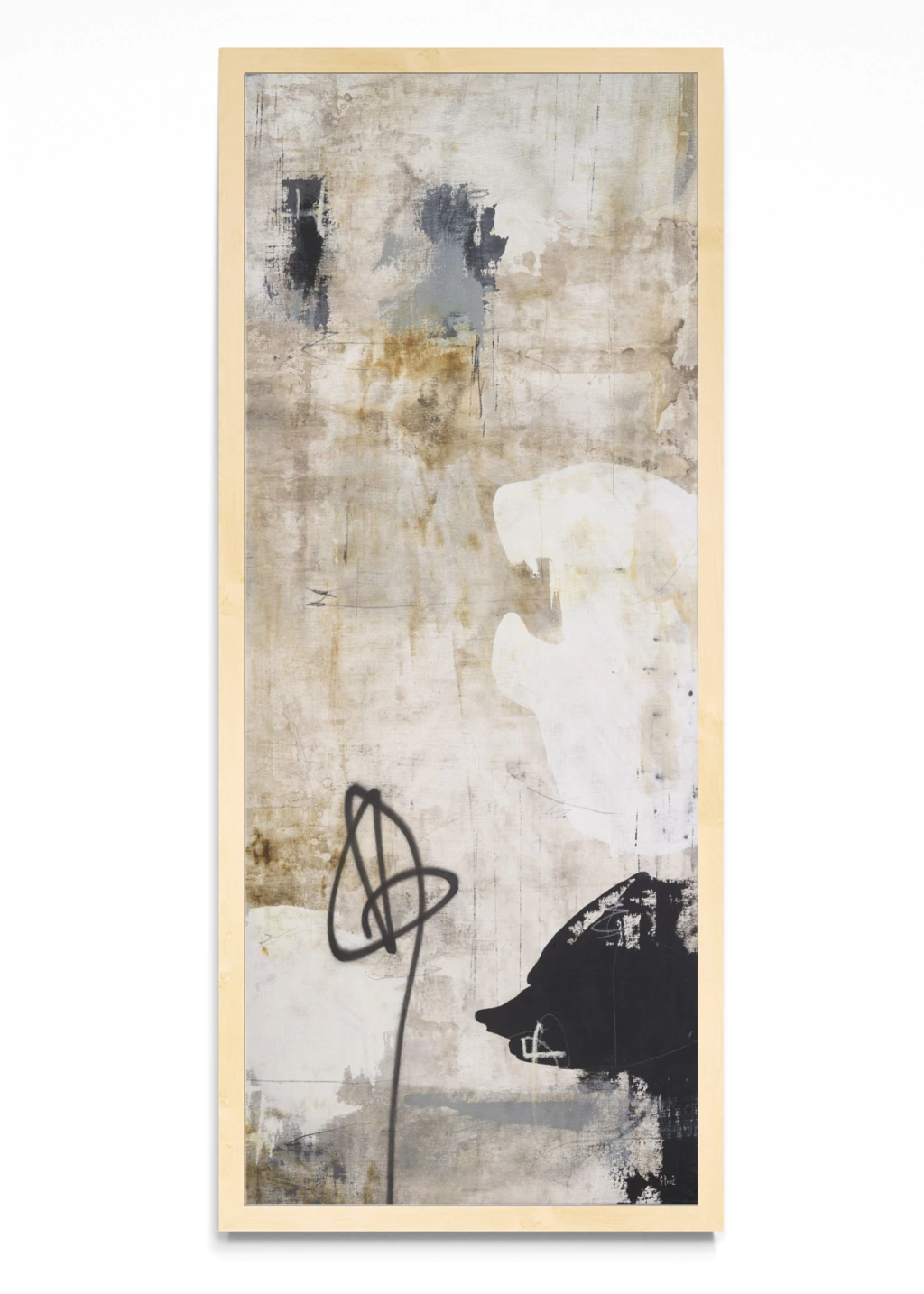 Obra abstracta que transmite calma y profundidad. una mancha oscura y otra clara aportan contraste, un poco de aerosol incorpora movimiento a la composición.