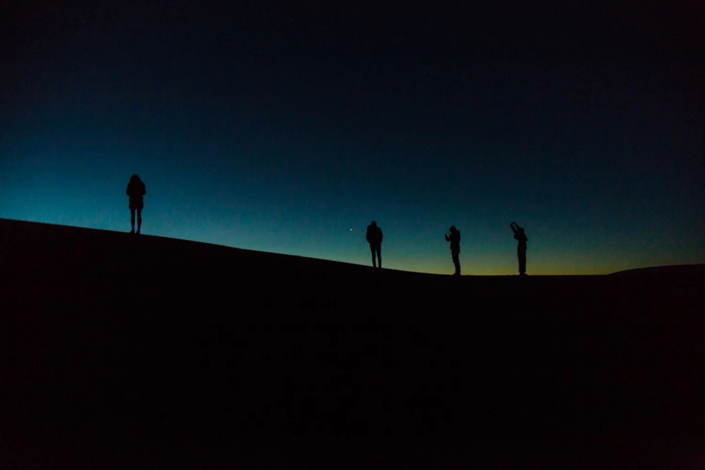 Siluetas de personas en el desierto de Merzouga, en Marruecos, durante el fin de la noche momentos antes del amanecer.