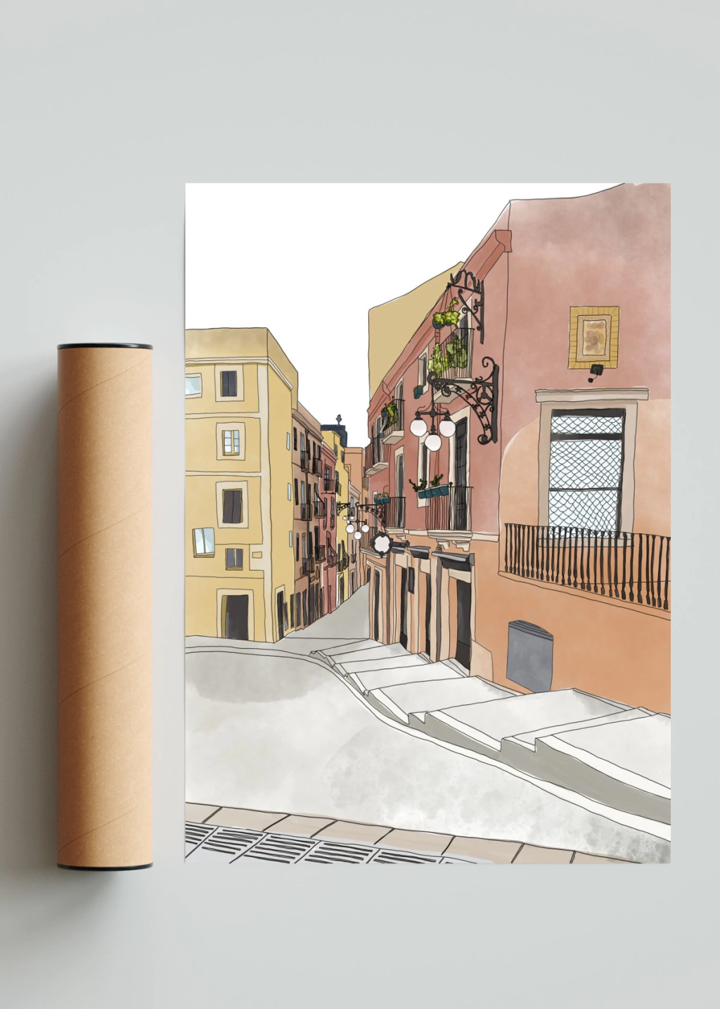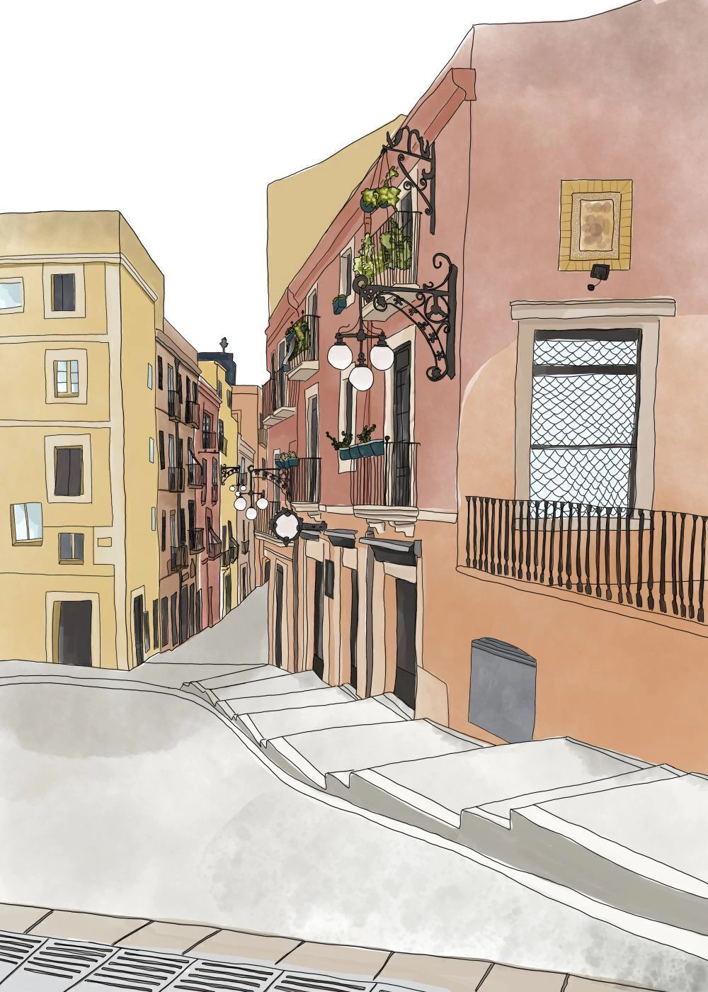 Redibujando Tarragona. Ilustración de las fachadas de una esquina de la ciudad catalana.