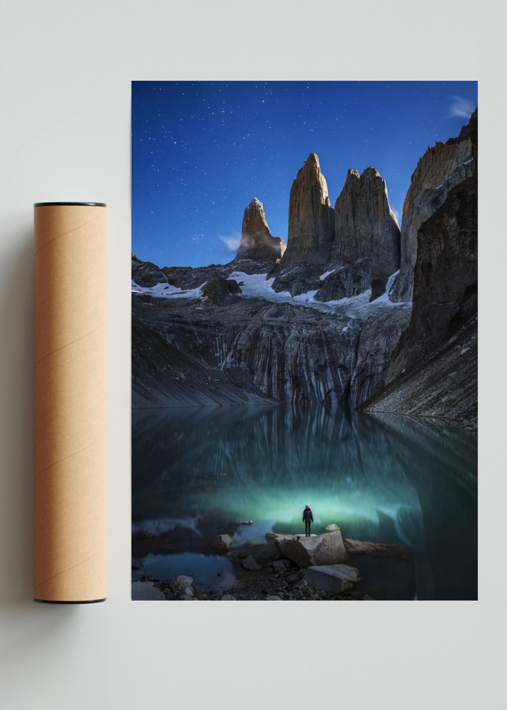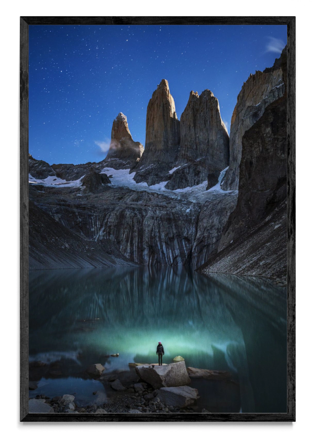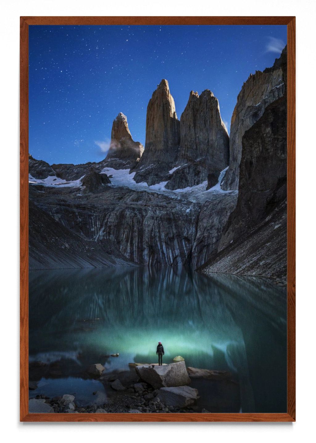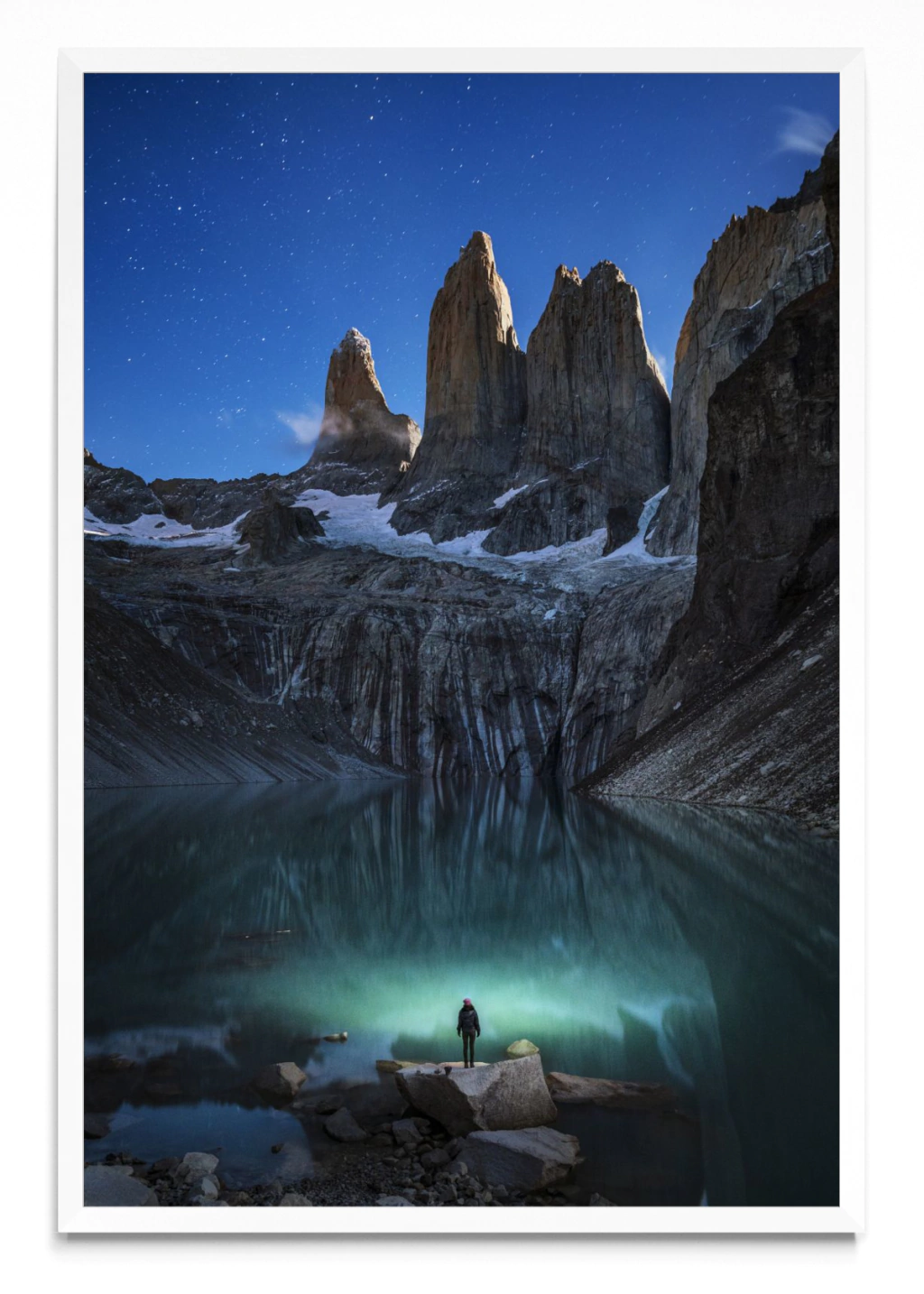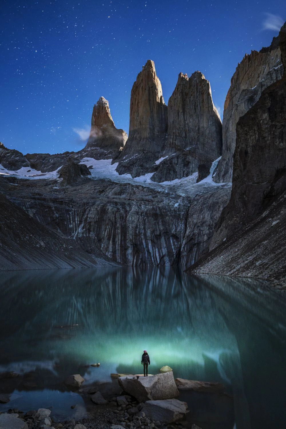 Contraluz de luna llena ilumina a las Torres del Paine. Con linterna frontal se ilumina el agua. 25"- iso1600 - f4