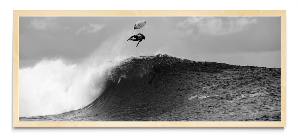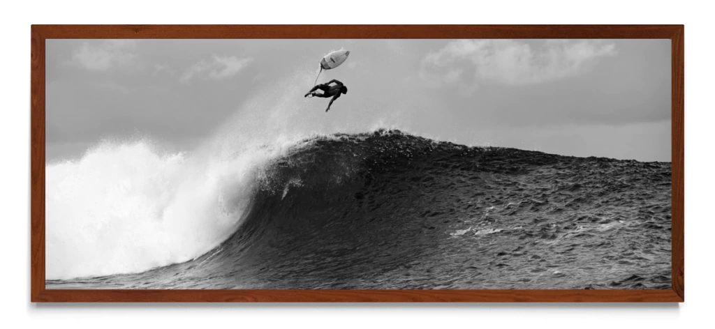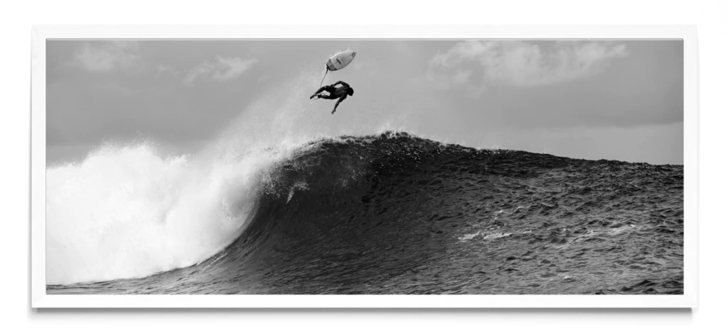 Un surfista vuela por encima de Teahupo'o, justo en el punto donde la ola se pliega con fuerza. El mar abajo, el aire arriba: pura tensión en equilibrio.
